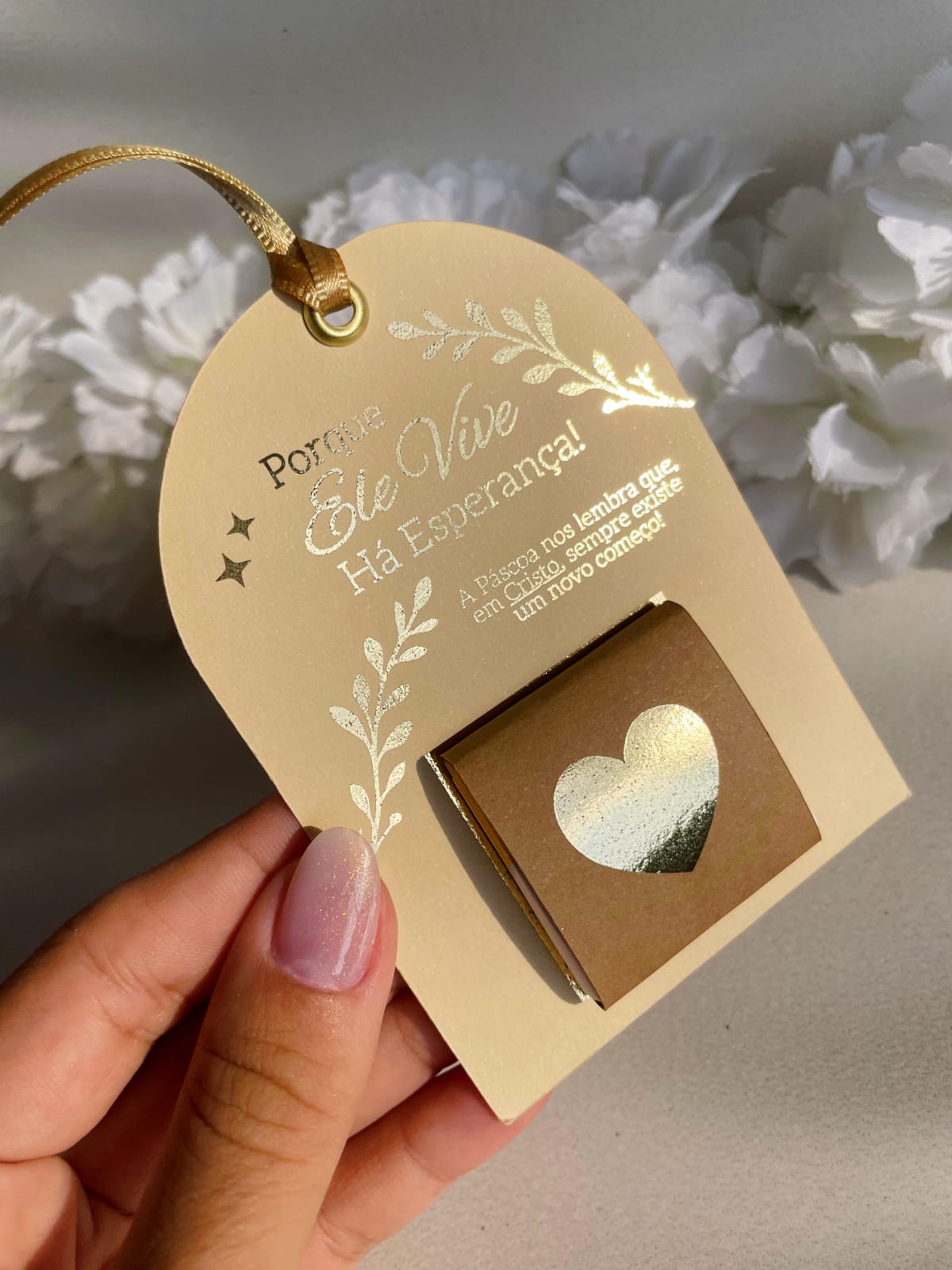 Uma lembrancinha delicada para celebrar a verdadeira Páscoa. O cartão traz uma mensagem cristã especial e acompanha um chocolate, formando um mimo cheio de carinho e significado.