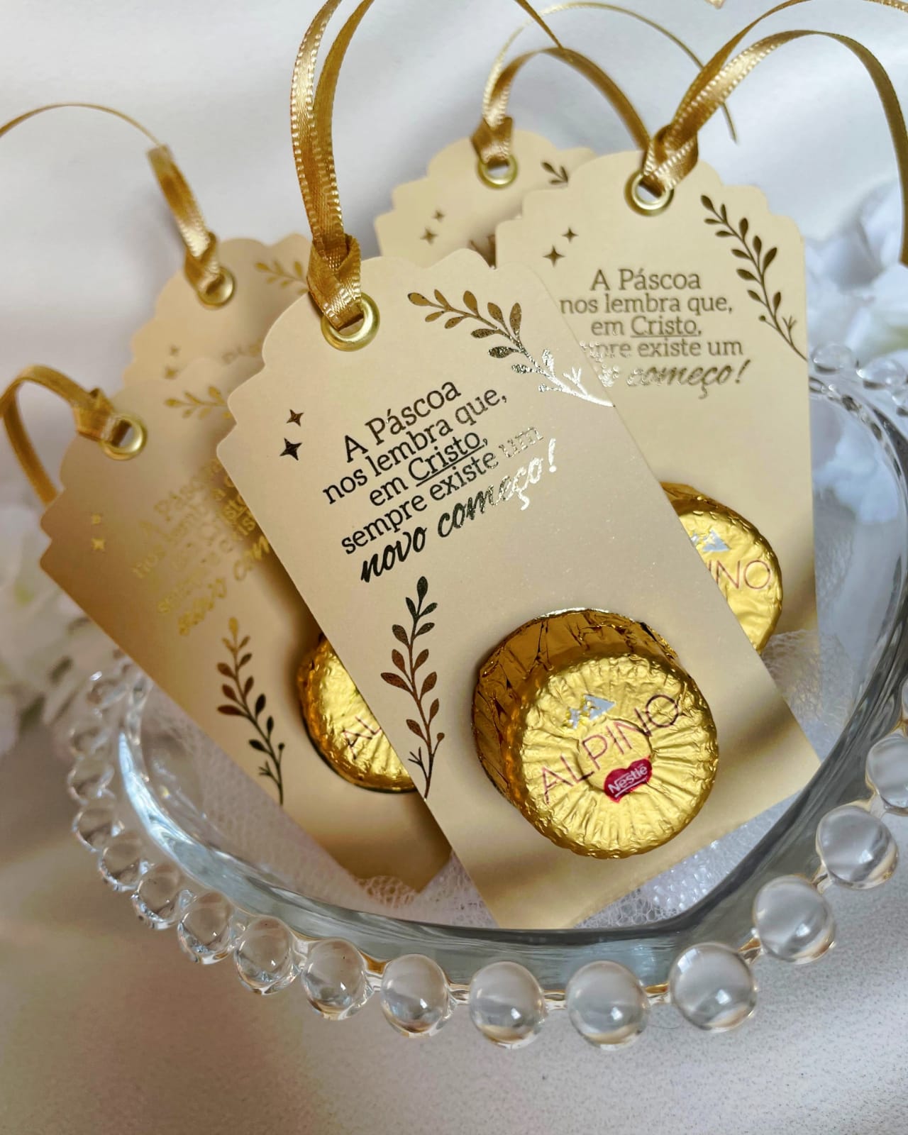 Uma lembrancinha delicada para celebrar a verdadeira Páscoa. O cartão traz uma mensagem cristã especial e acompanha um chocolate, formando um mimo cheio de carinho e significado.
